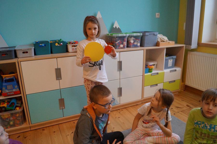 Grupa starsza na dzisiejszych zajęciach utrwalała znajomość podstawowych figur geometrycznych: koła, trójkąta, kwadratu i prostokąta w toku podejmowania różnych zadań.