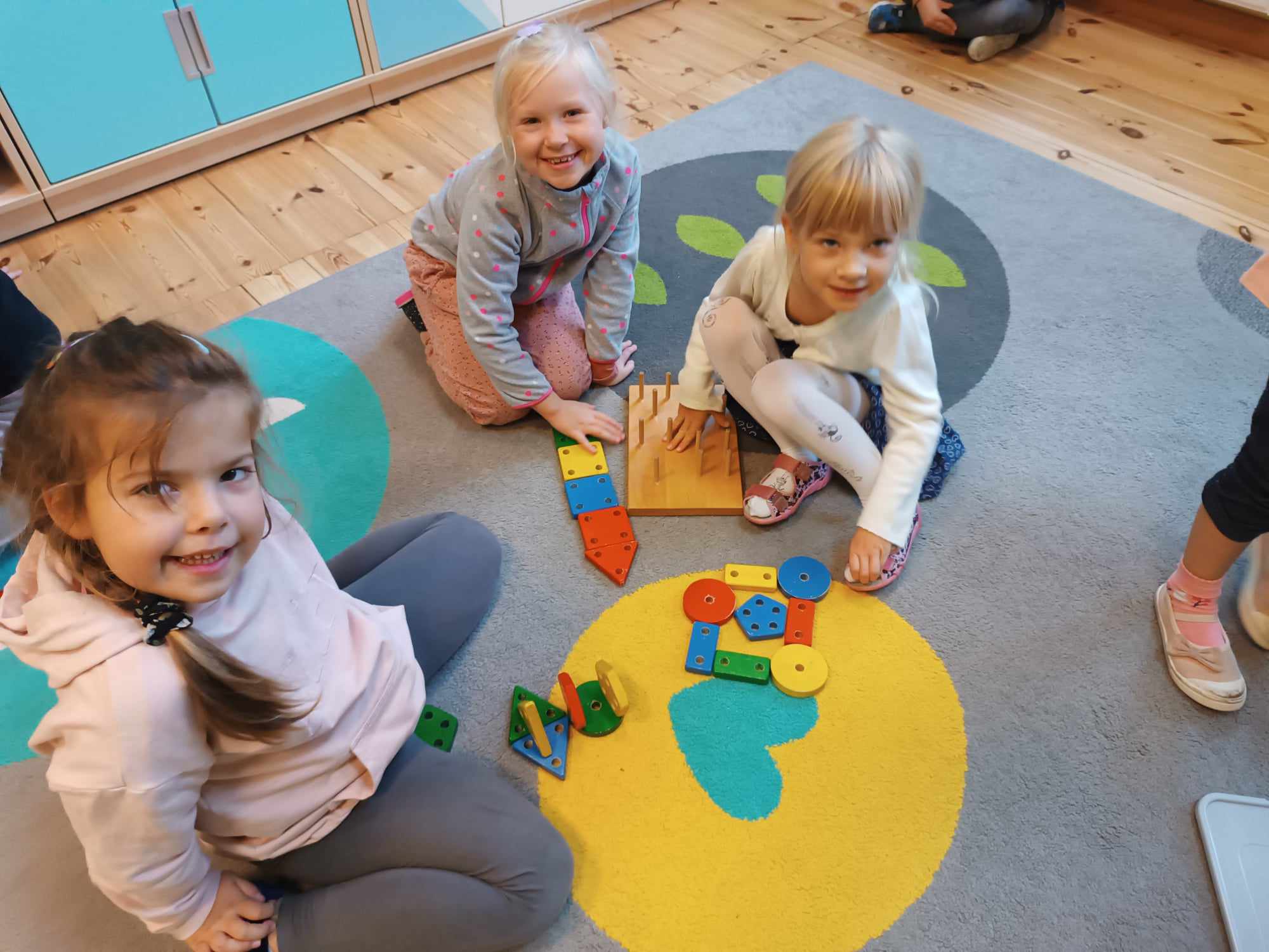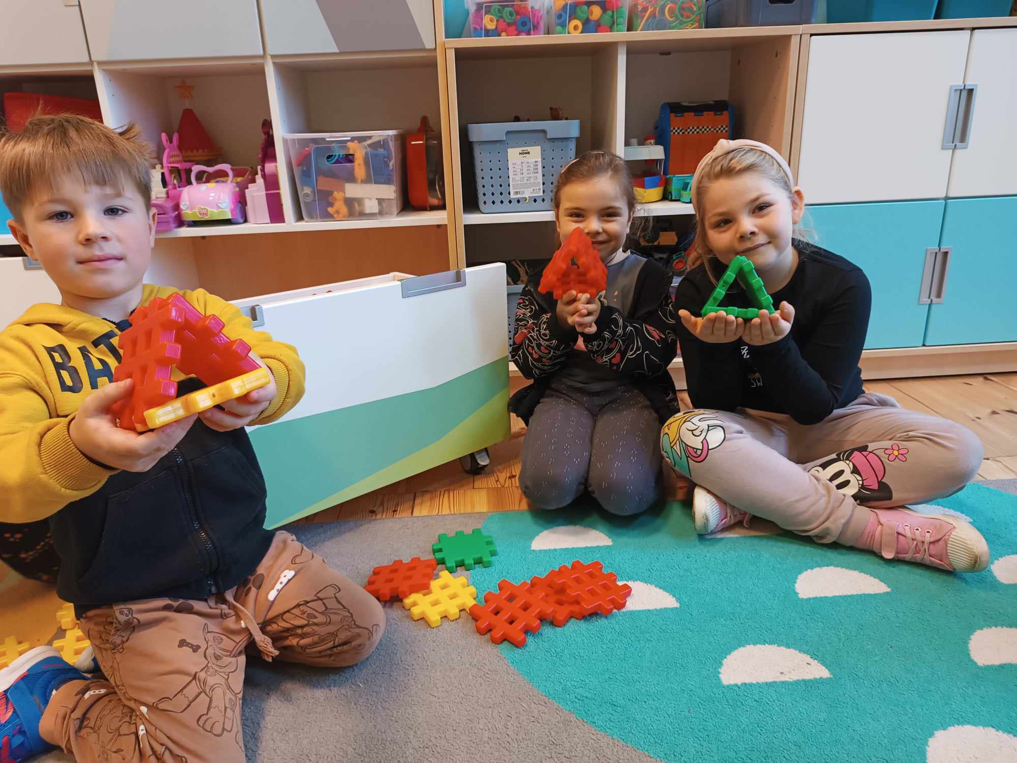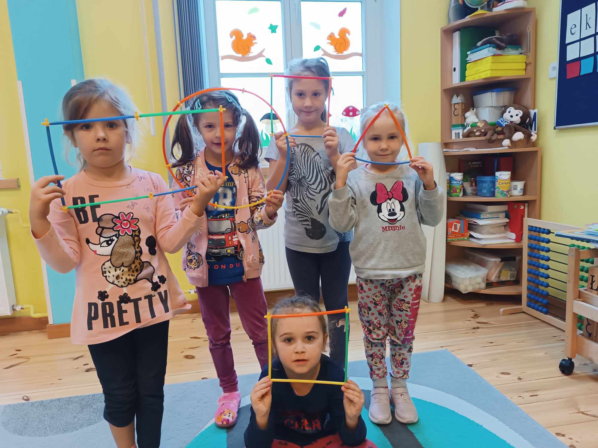 Grupa Bratki utrwalała dzisiaj znajomość poznanych figur geometrycznych: trójkąta, koła, kwadratu i prostokąta, jednocześnie przy tym świetne się bawiąc.