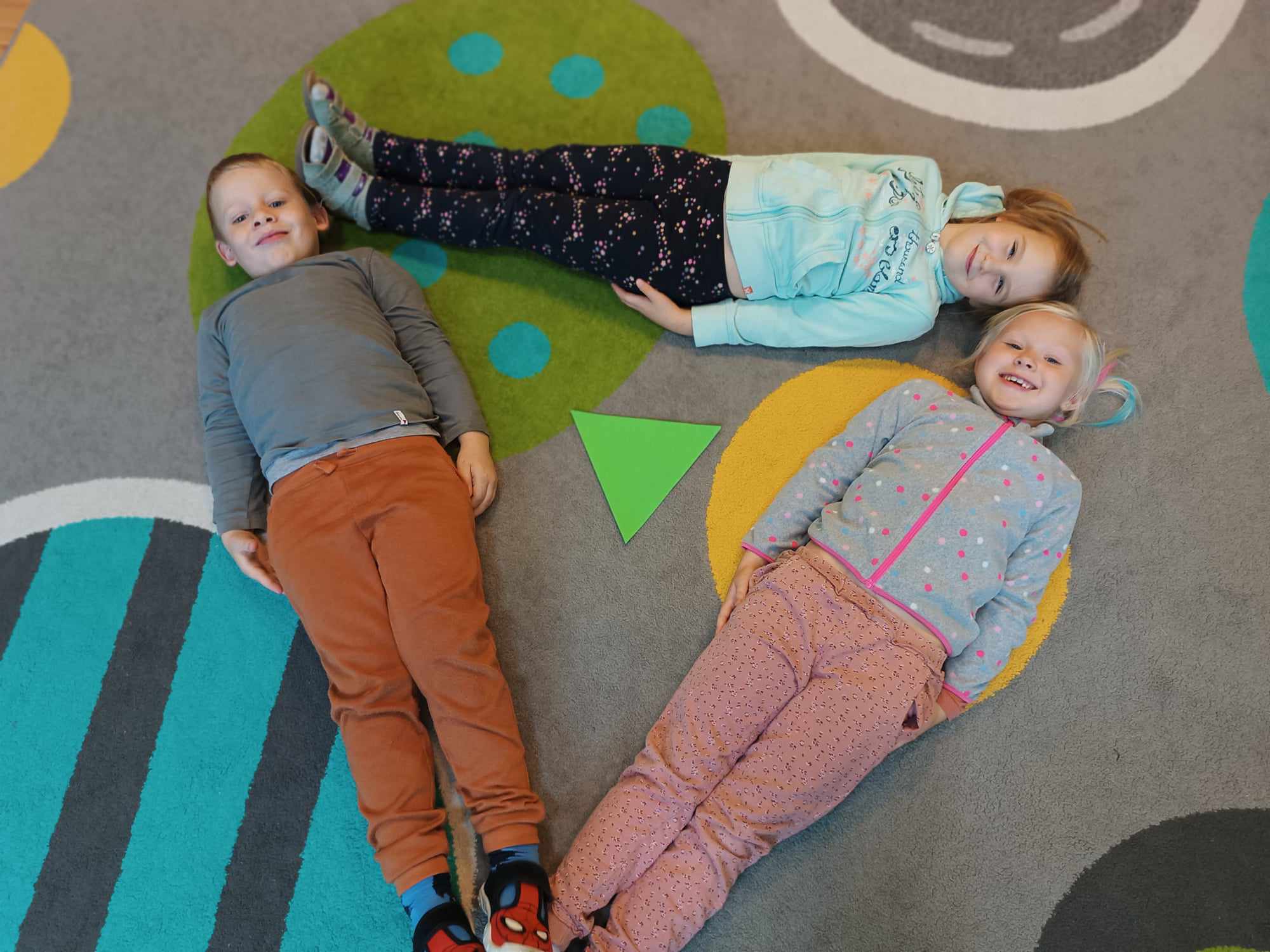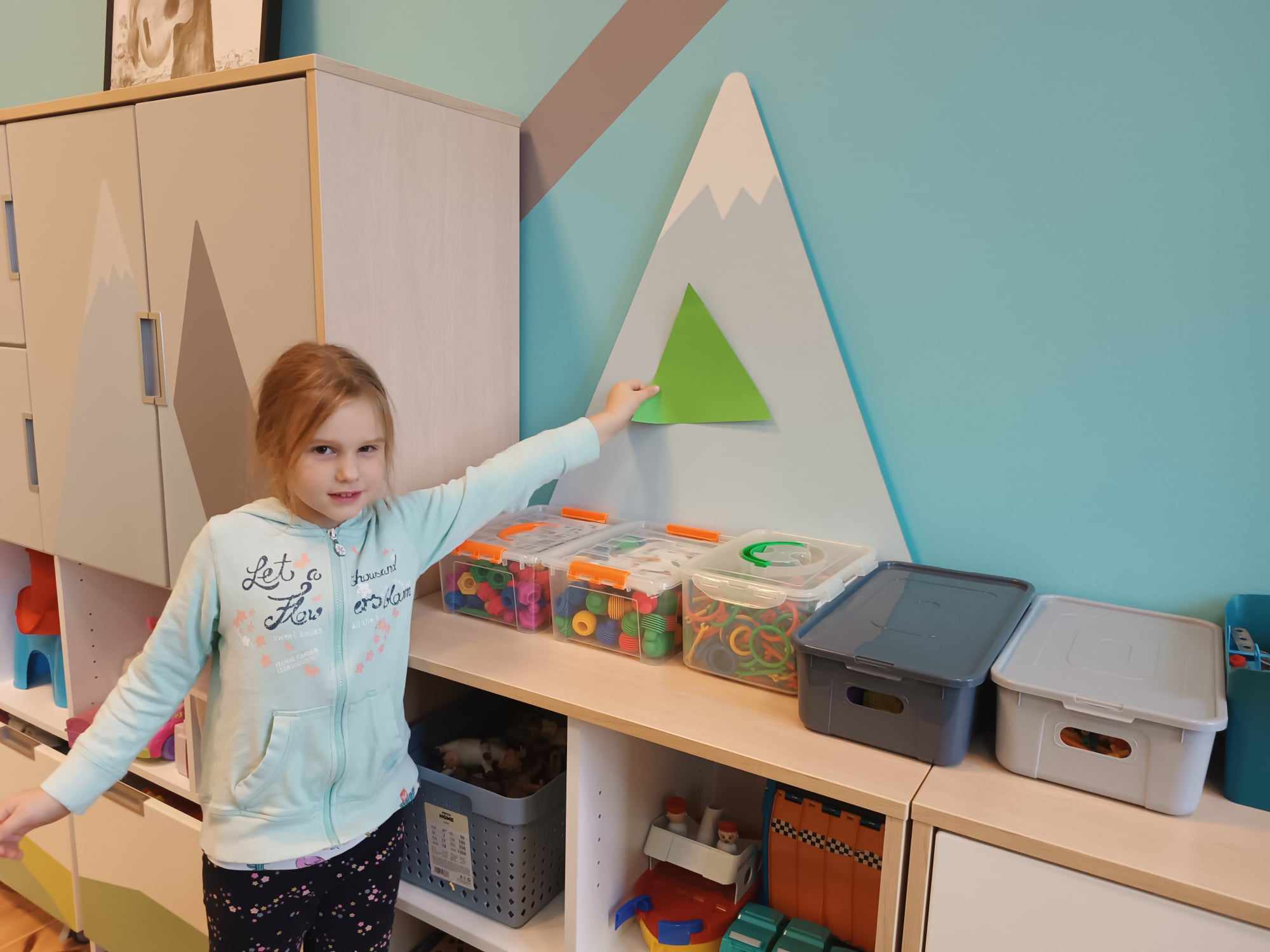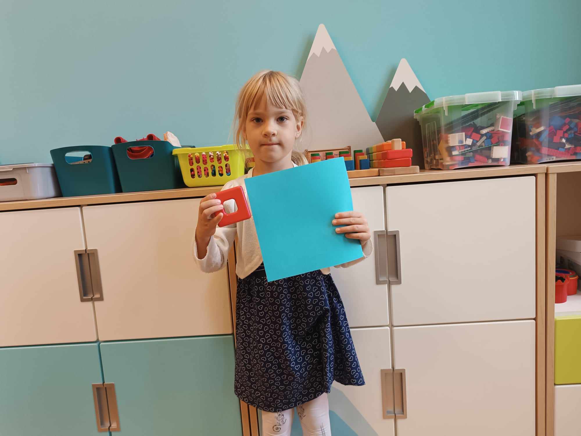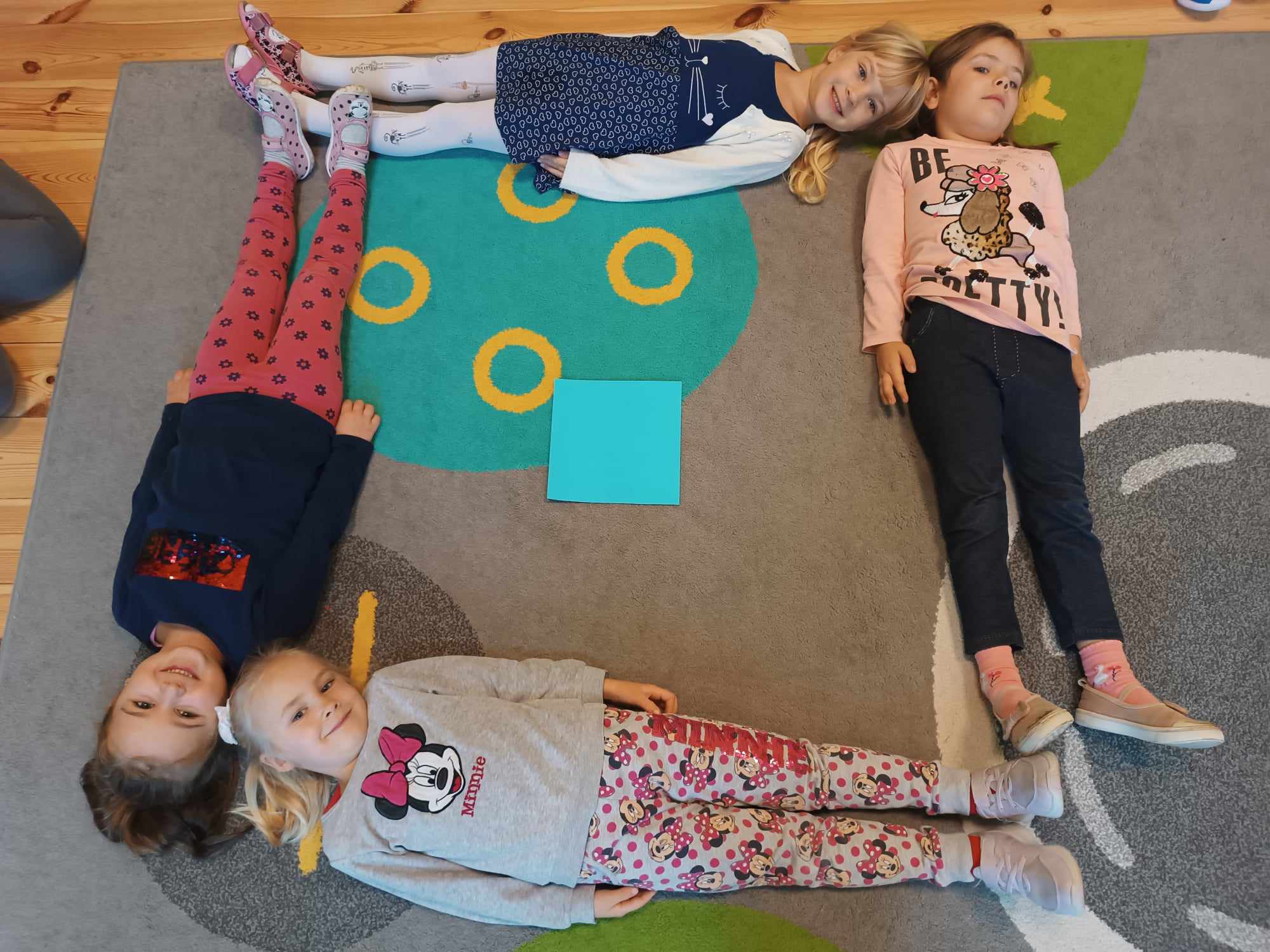 Grupa Bratki utrwalała dzisiaj znajomość poznanych figur geometrycznych: trójkąta, koła, kwadratu i prostokąta, jednocześnie przy tym świetne się bawiąc.