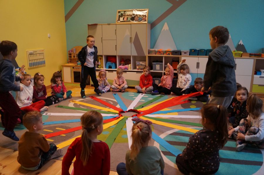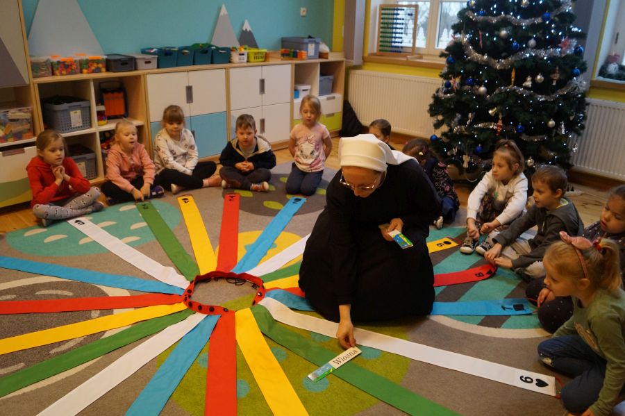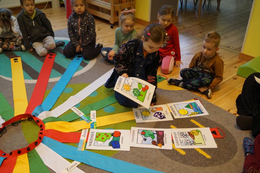 „Wiatrak matematyczny” ma wszechstronne zastosowanie. Grupa starsza utrwalała z jego wykorzystaniem znajomość pór roku.