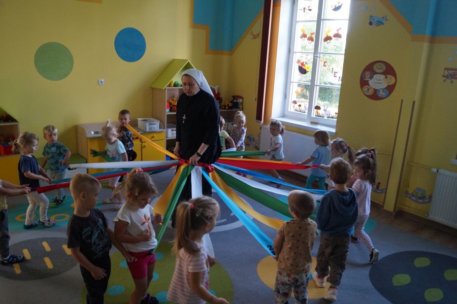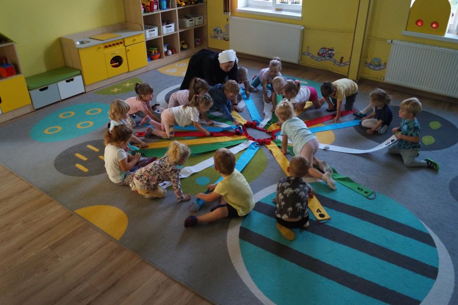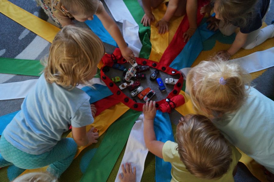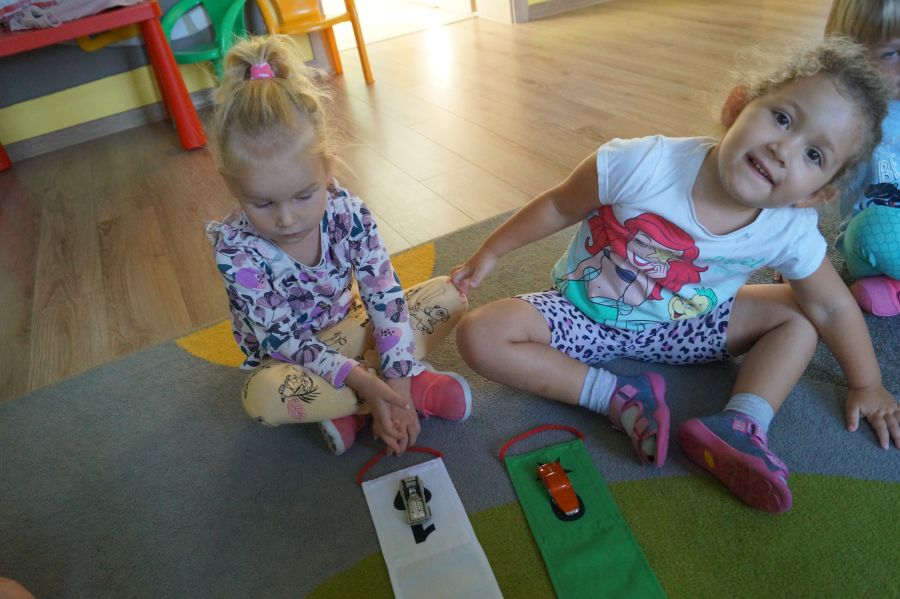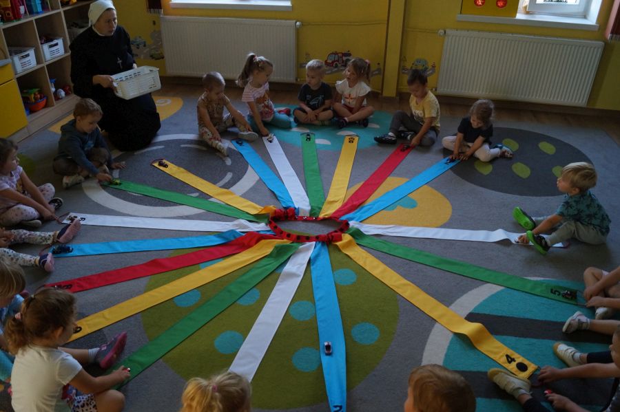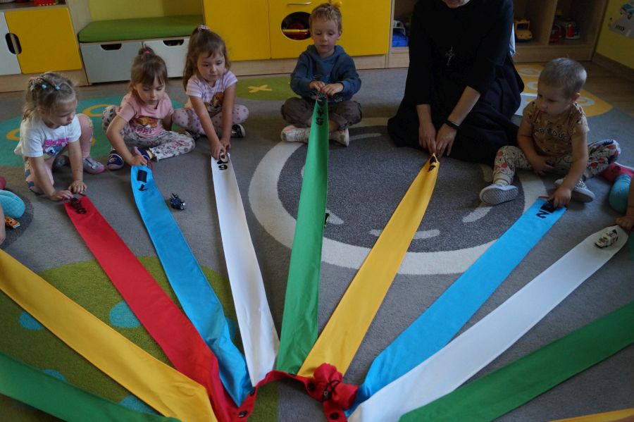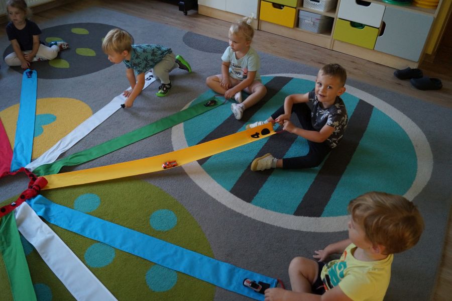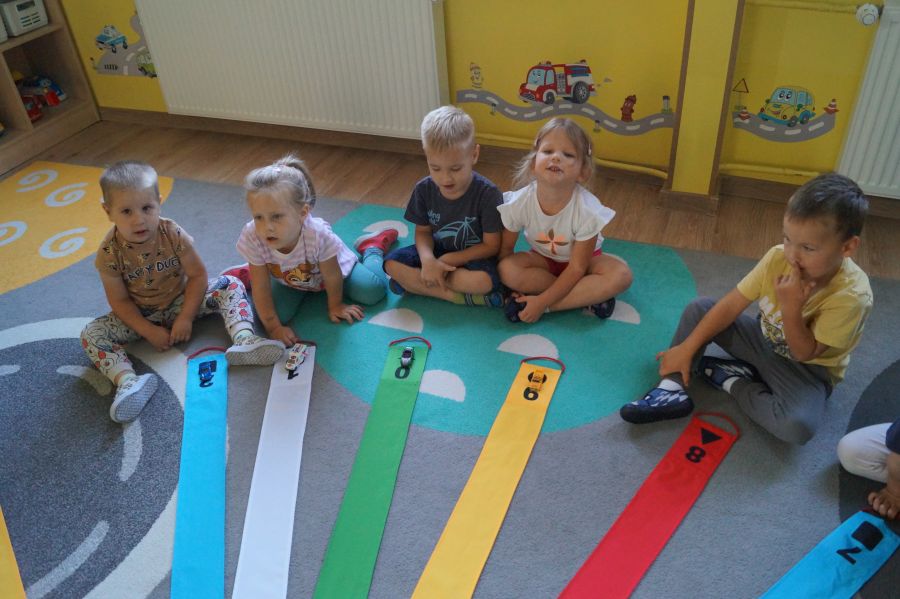 Grupa młodsza rozpoczęła swoją przygodę z „Wiatrakiem matematycznym”. Kończąc temat kompleksowy o ruchu ulicznym do naszej zabawy wykorzystaliśmy samochodziki, które parkowały w „garażach”- figurach geometrycznych, zjeżdżały z górek, jeździły na wyścigi, aż w końcu musiały pojechać do warsztatu ;). Tym sposobem dzieci zapoznały się z figurami, utrwaliły znajomość kolorów, ćwiczyły koordynację wzrokowo- ruchową.