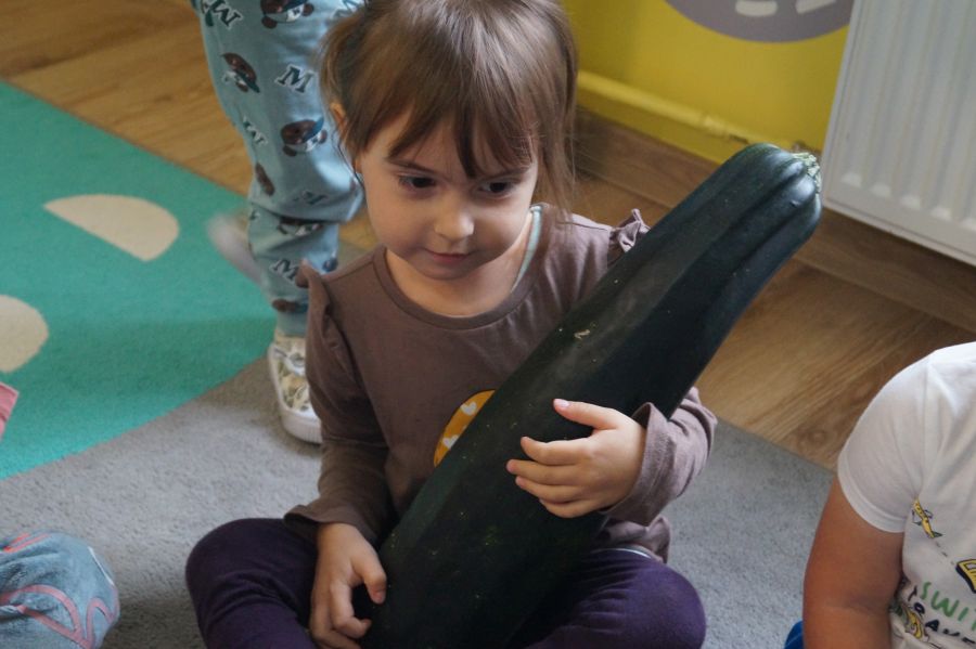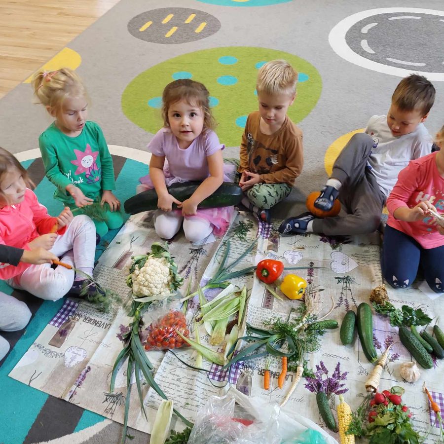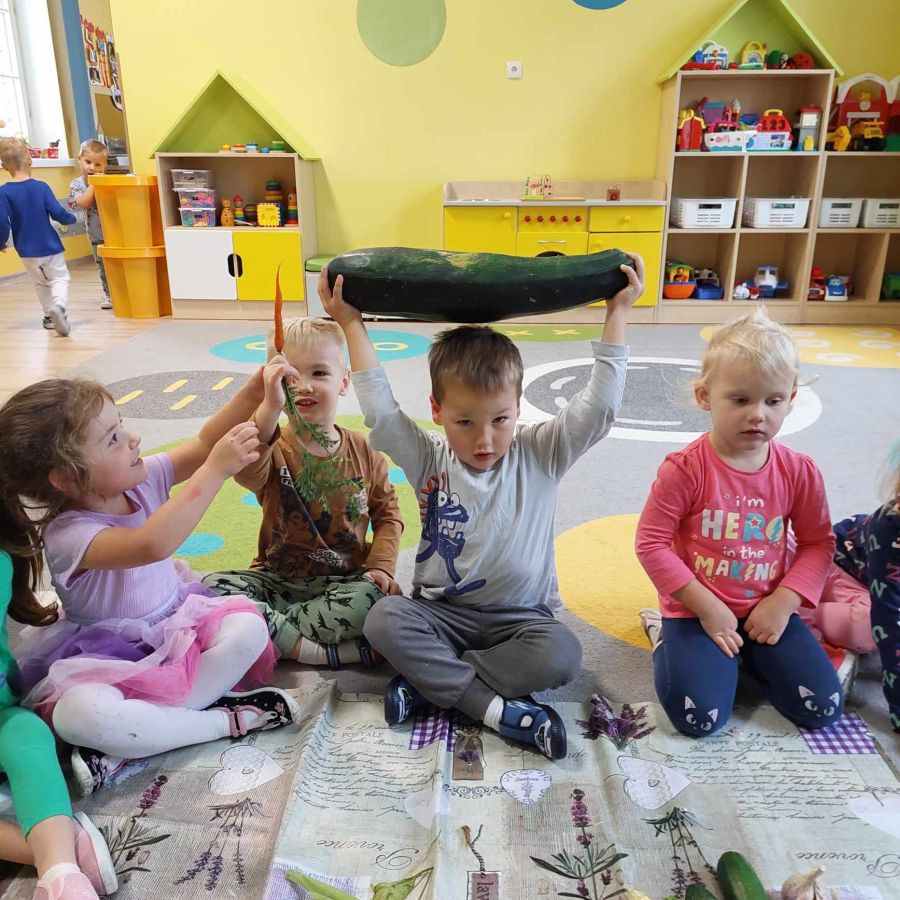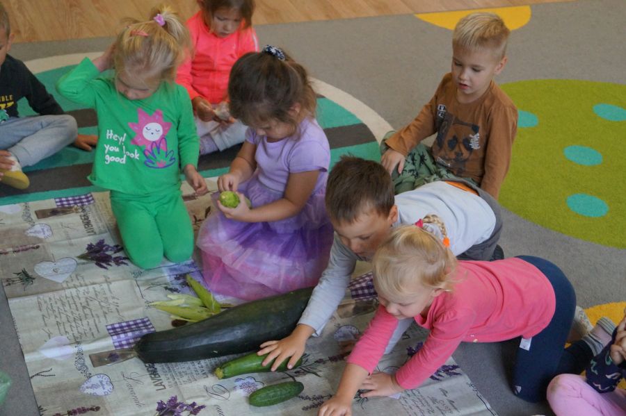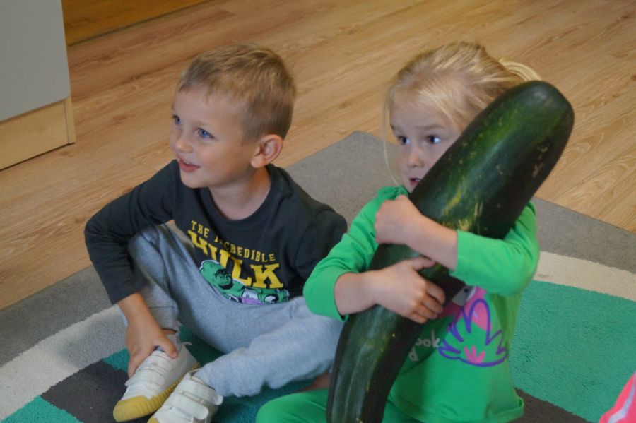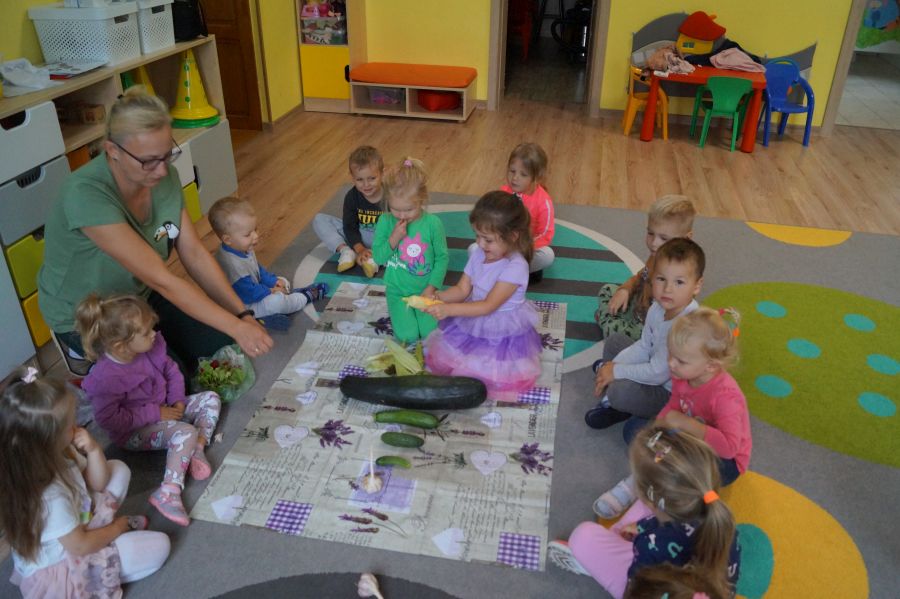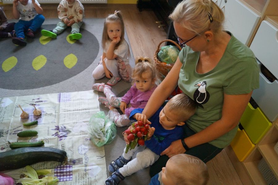 Dzisiaj Stokrotki uczyły się rozpoznawać i nazywać warzywa. Dzieci określały ich kształt, wielkość, kolor i przy tym się świetnie bawiły.