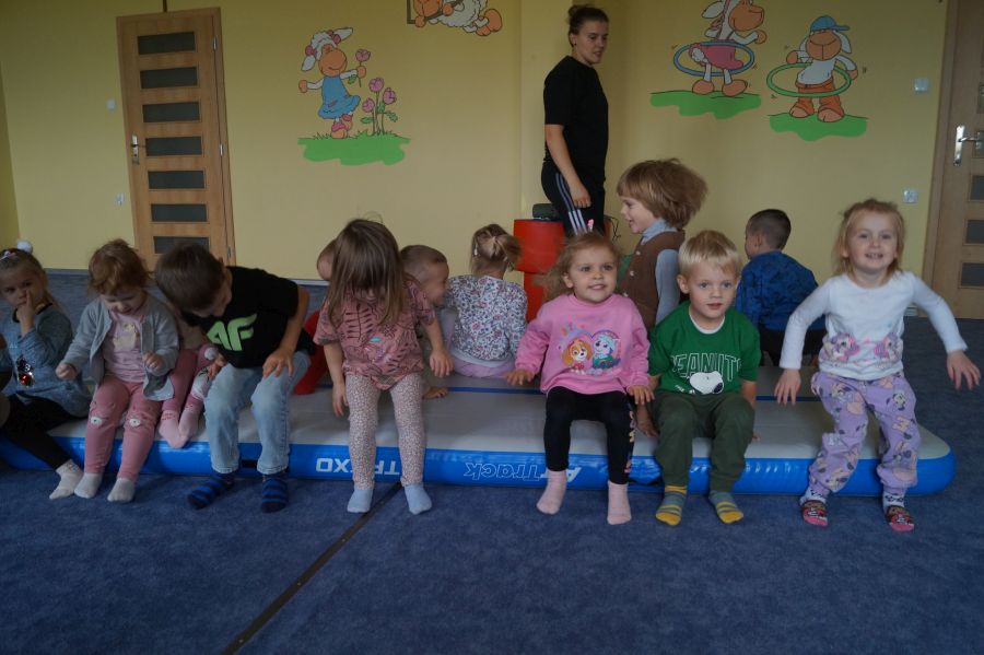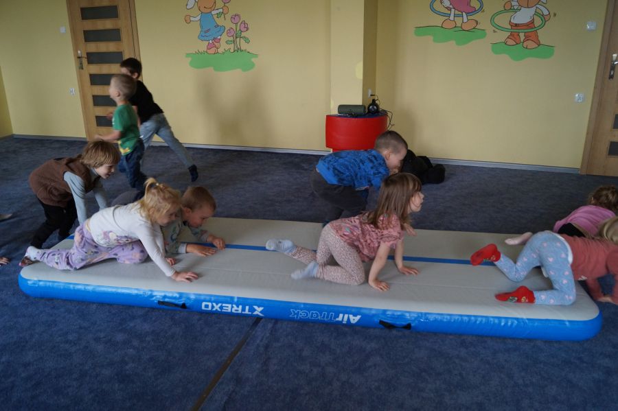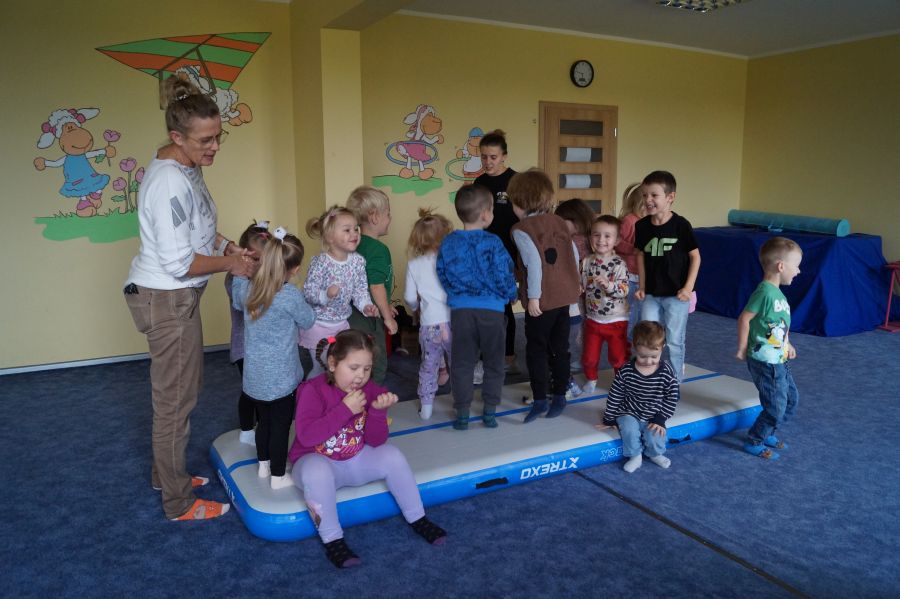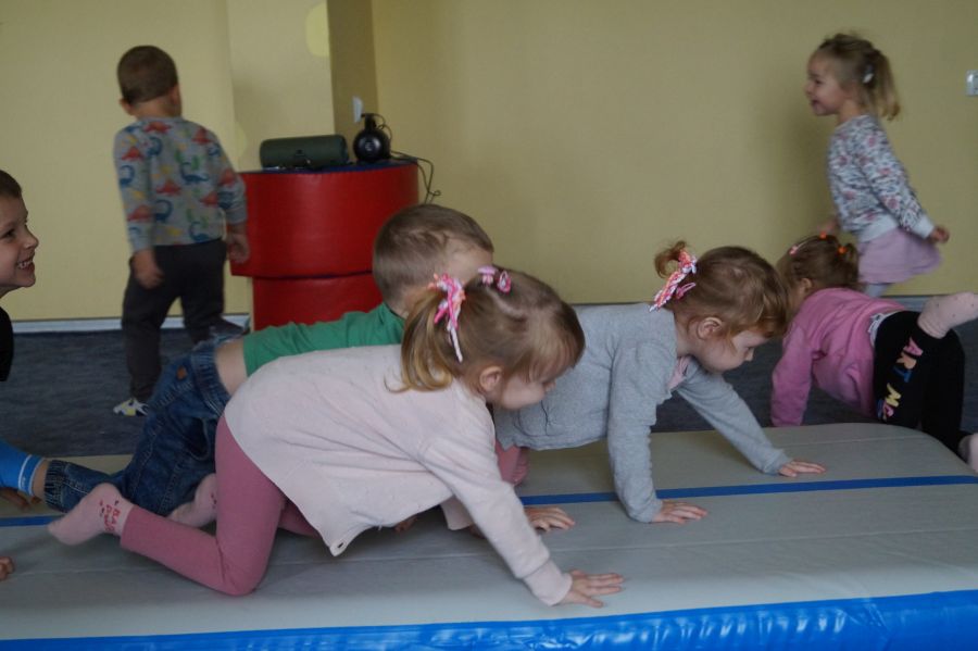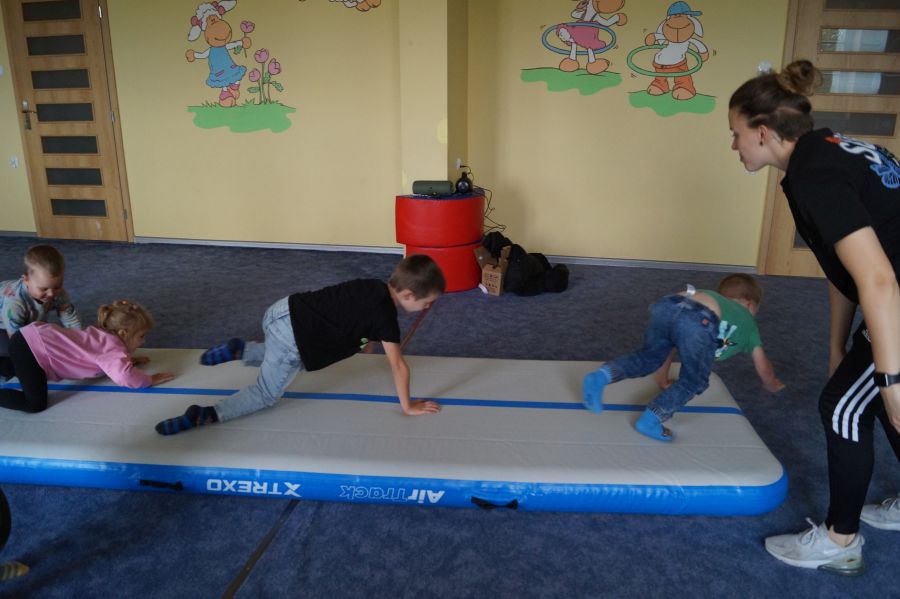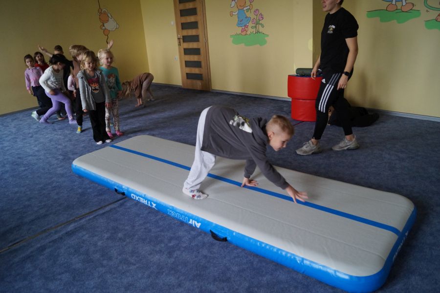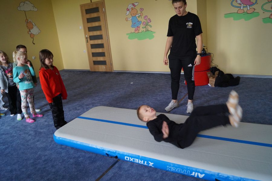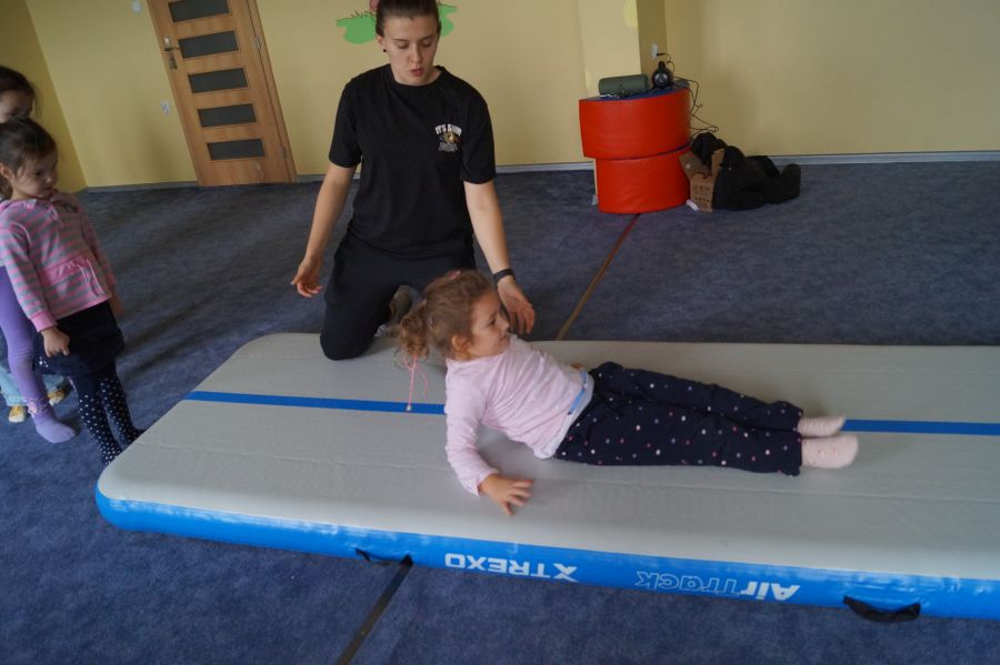 Przedstawicielka firmy sportowej, oferującej zajęcia z akrobatyki dla dzieci przeprowadziła zajęcia pokazowe w obu grupach. Dzieci oczywiście bardzo chętnie wzięły w nich udział 😉