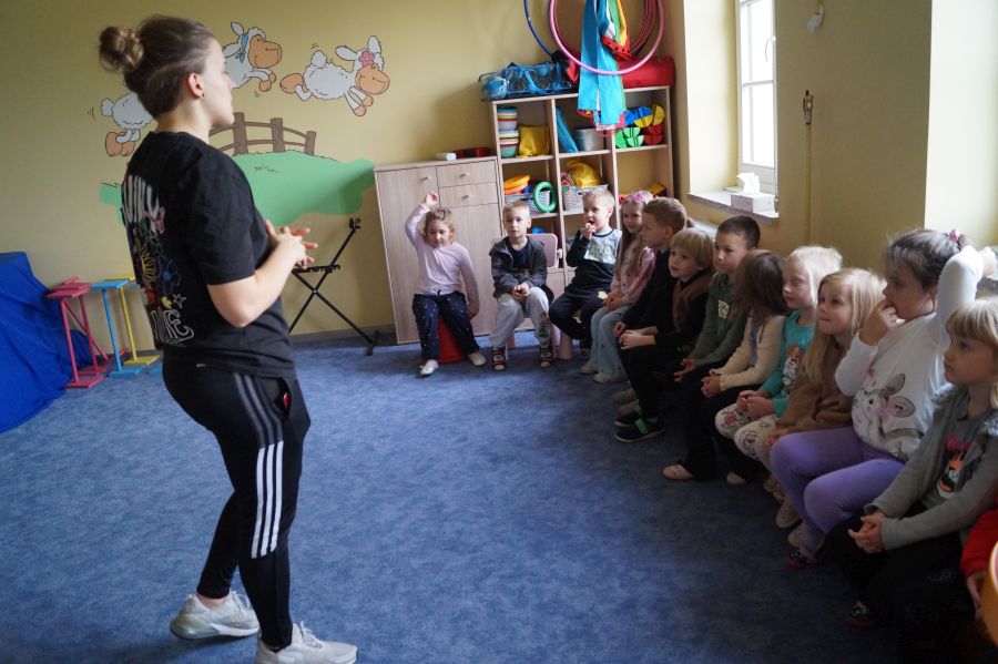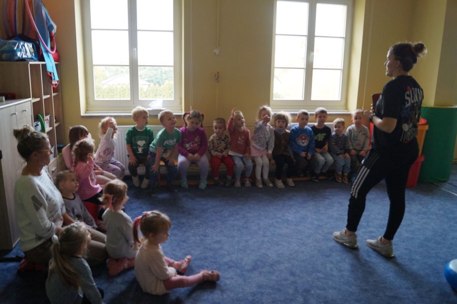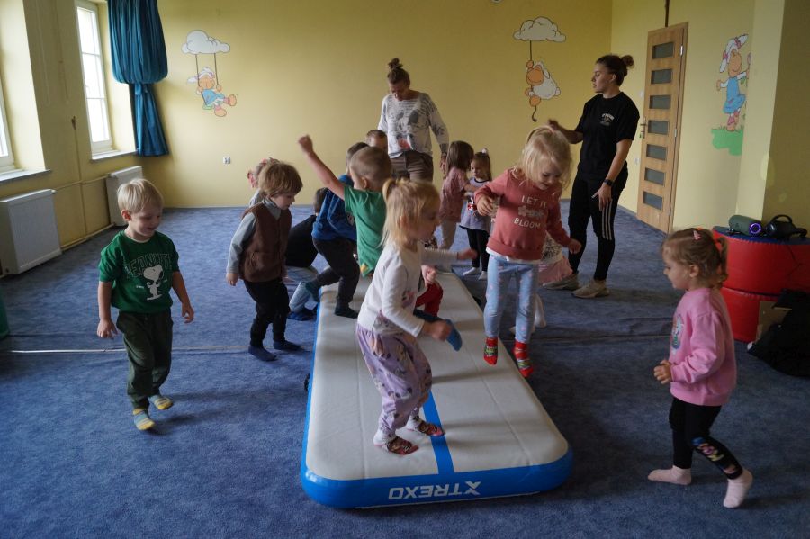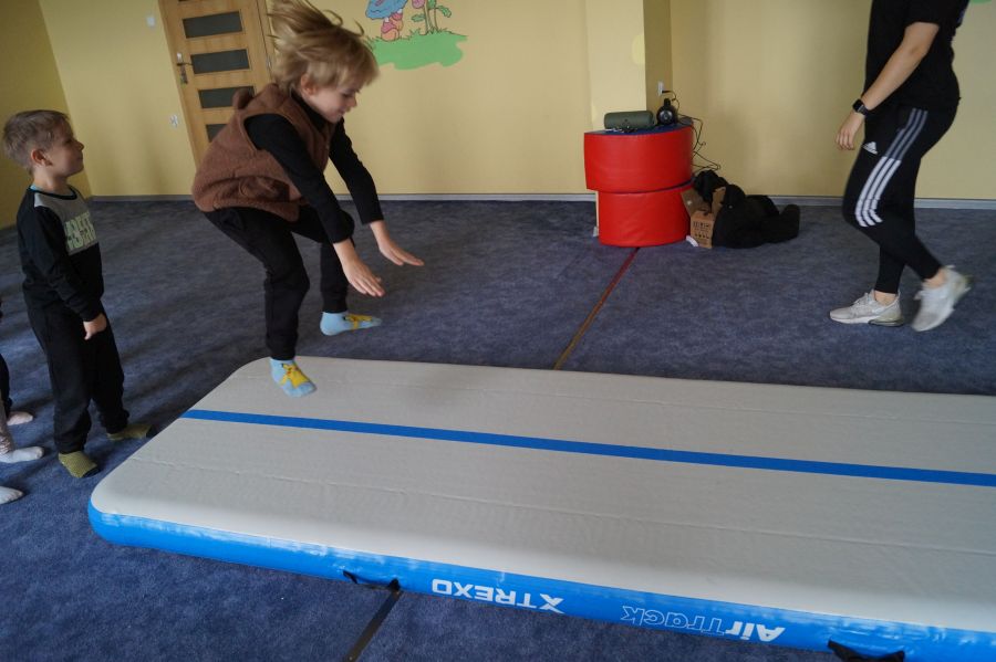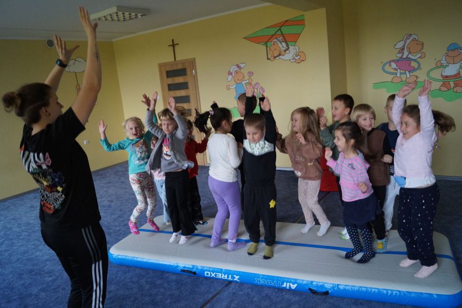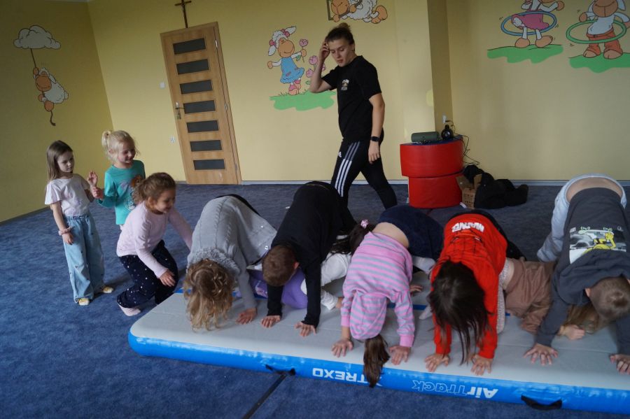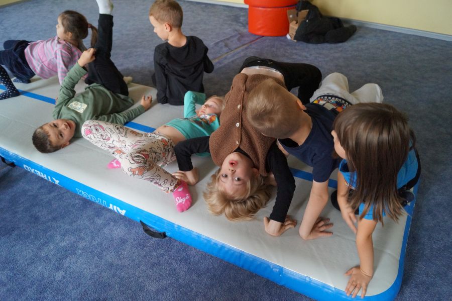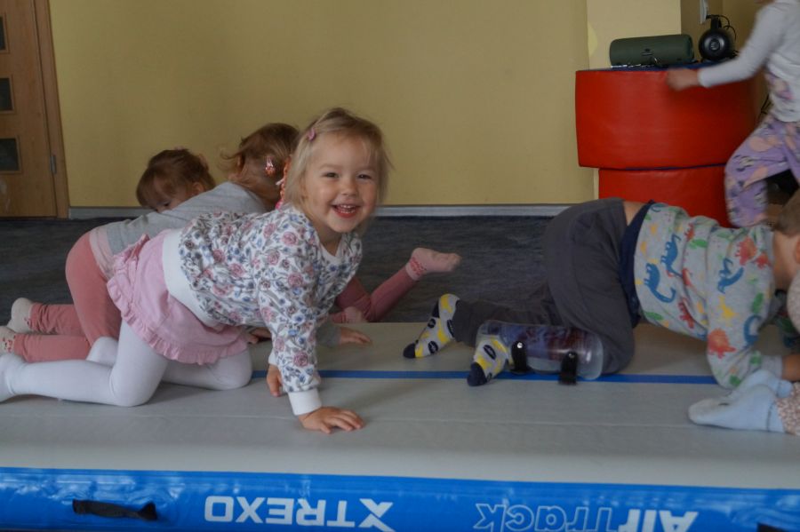 Przedstawicielka firmy sportowej, oferującej zajęcia z akrobatyki dla dzieci przeprowadziła zajęcia pokazowe w obu grupach. Dzieci oczywiście bardzo chętnie wzięły w nich udział 😉