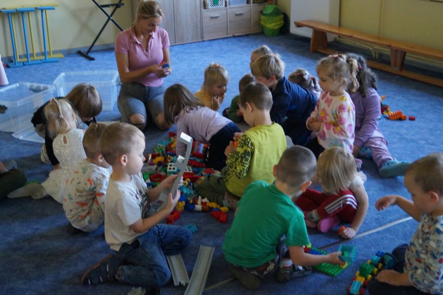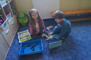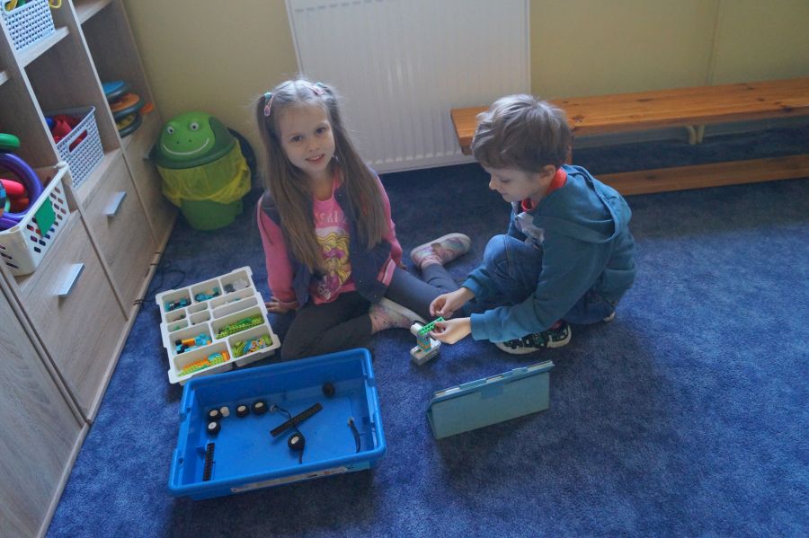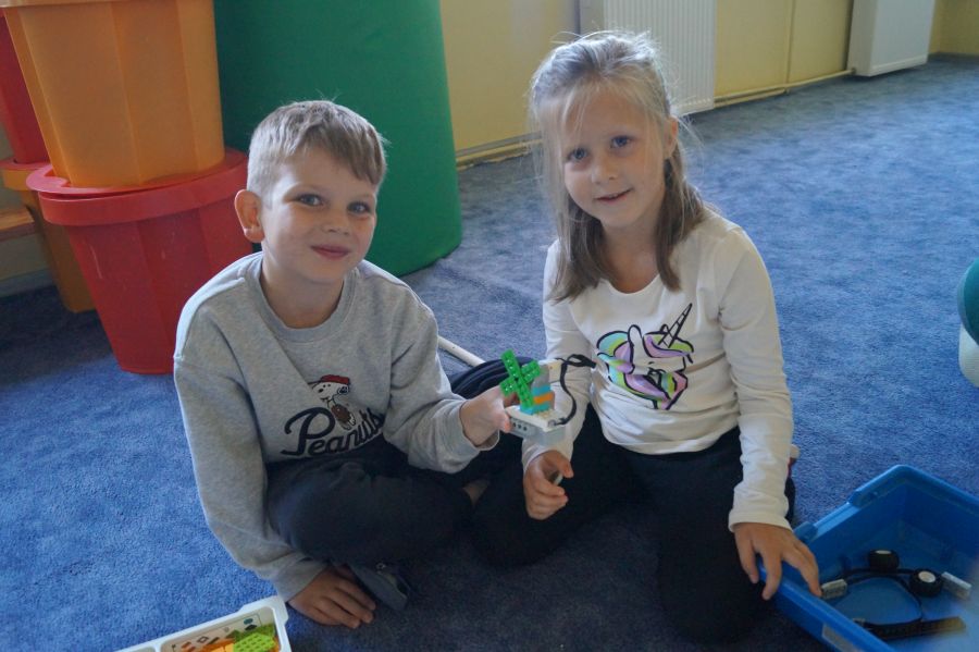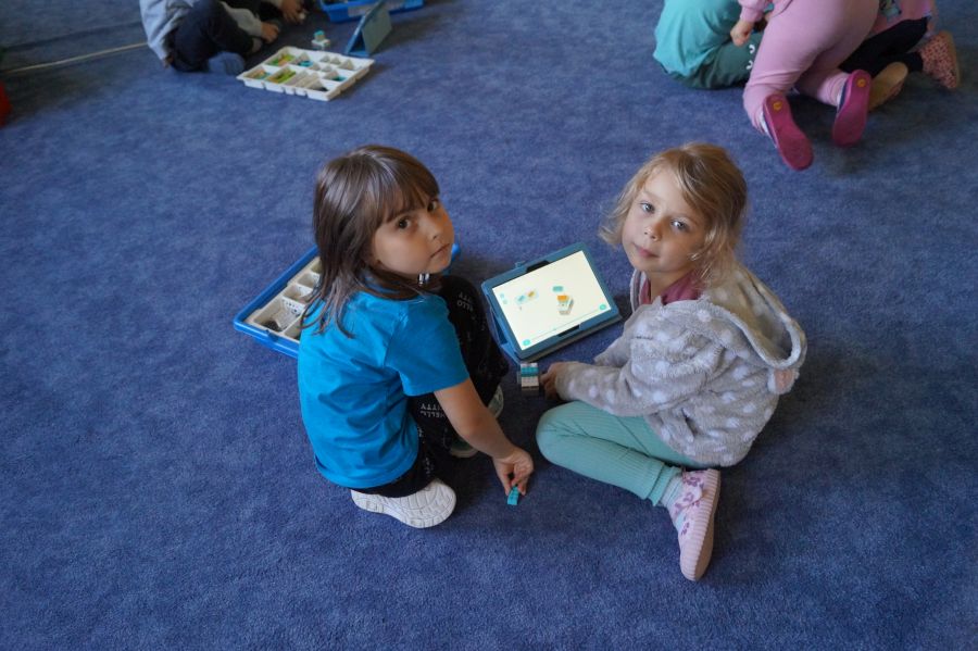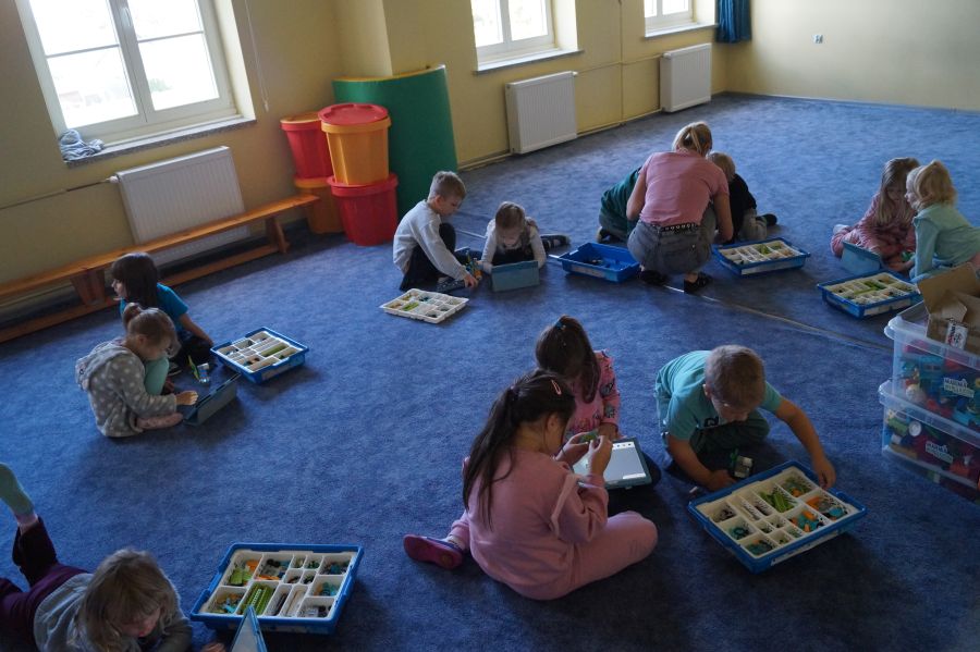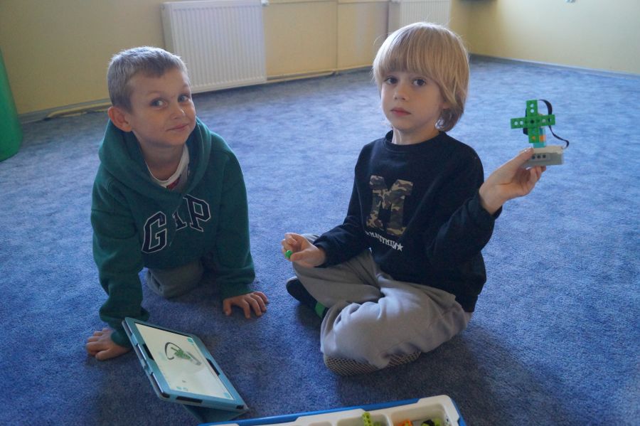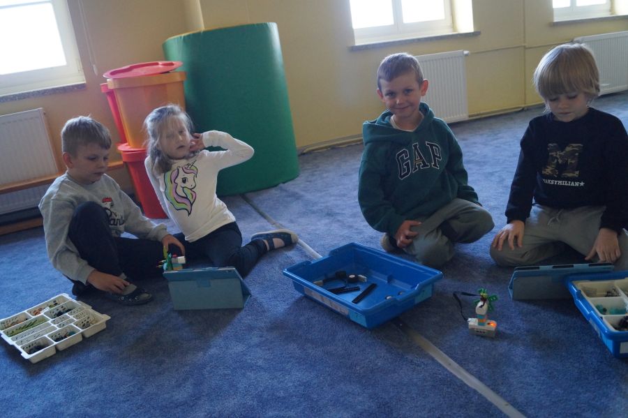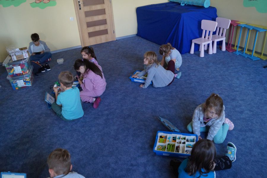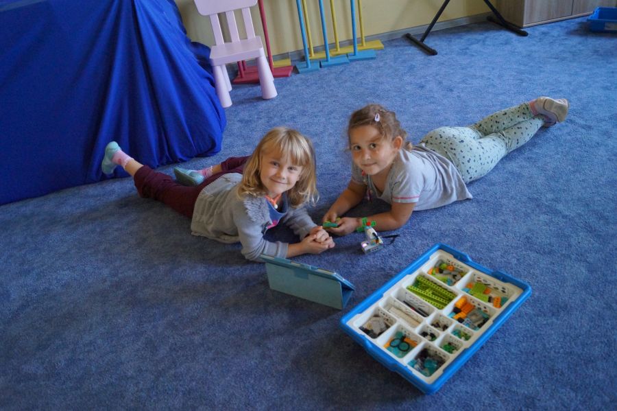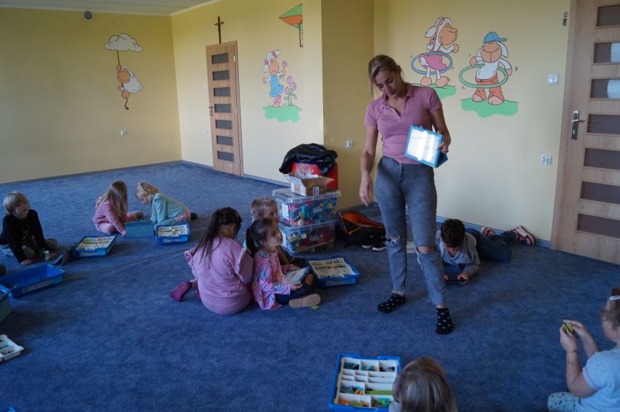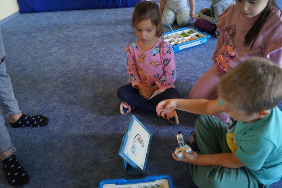Obie grupy dzieci miały okazję skorzystać z zajęć pokazowych z robotyki. Dzieci bardzo skupione mogły zapoznać się z różnymi sposobami wykorzystania klocków, pracy z z tabletami w małej grupie.
