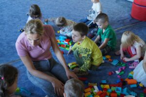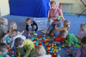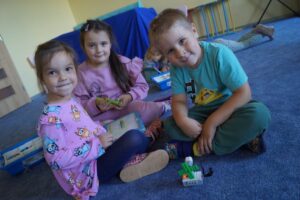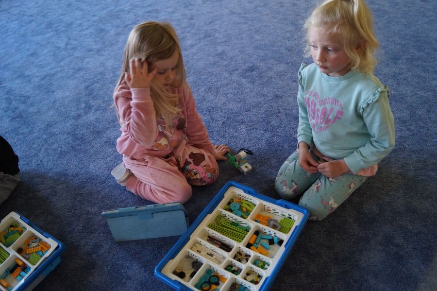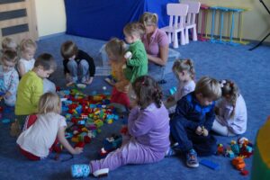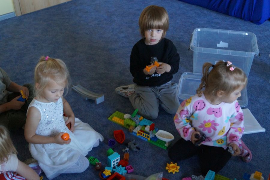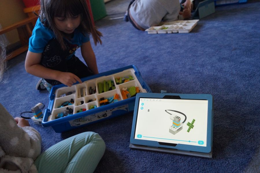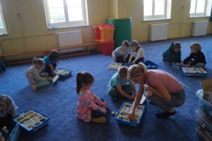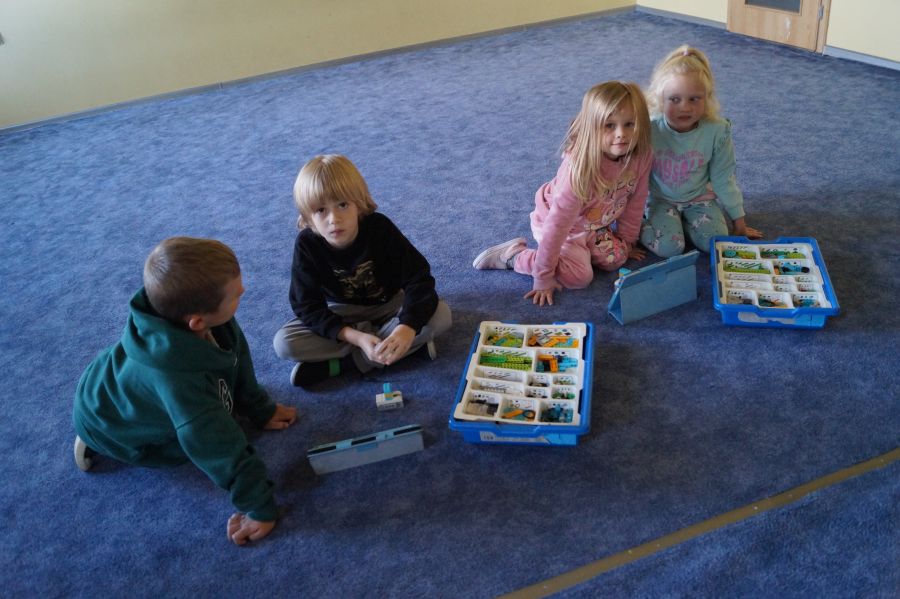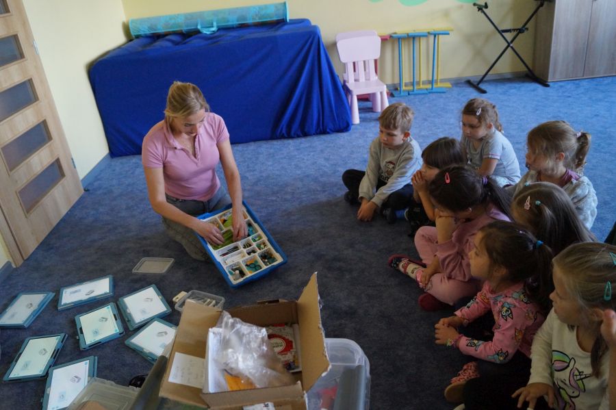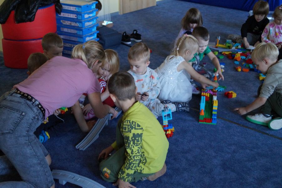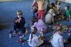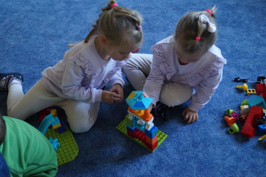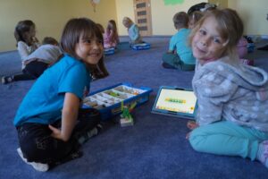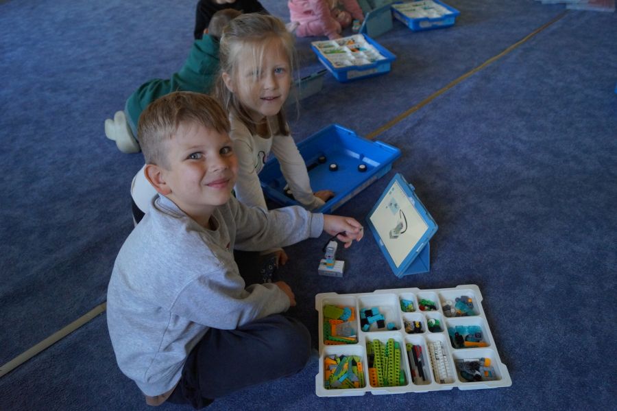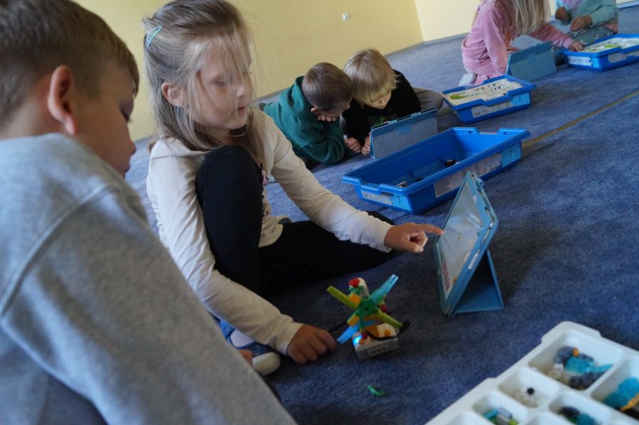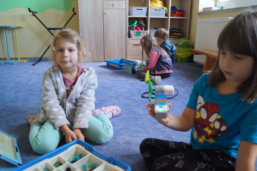 Obie grupy dzieci miały okazję skorzystać z zajęć pokazowych z robotyki. Dzieci bardzo skupione mogły zapoznać się z różnymi sposobami wykorzystania klocków, pracy z z tabletami w małej grupie.