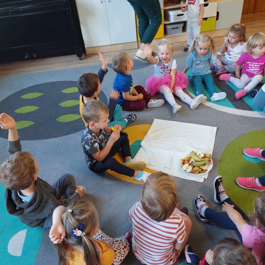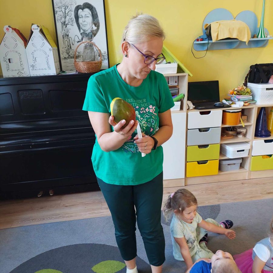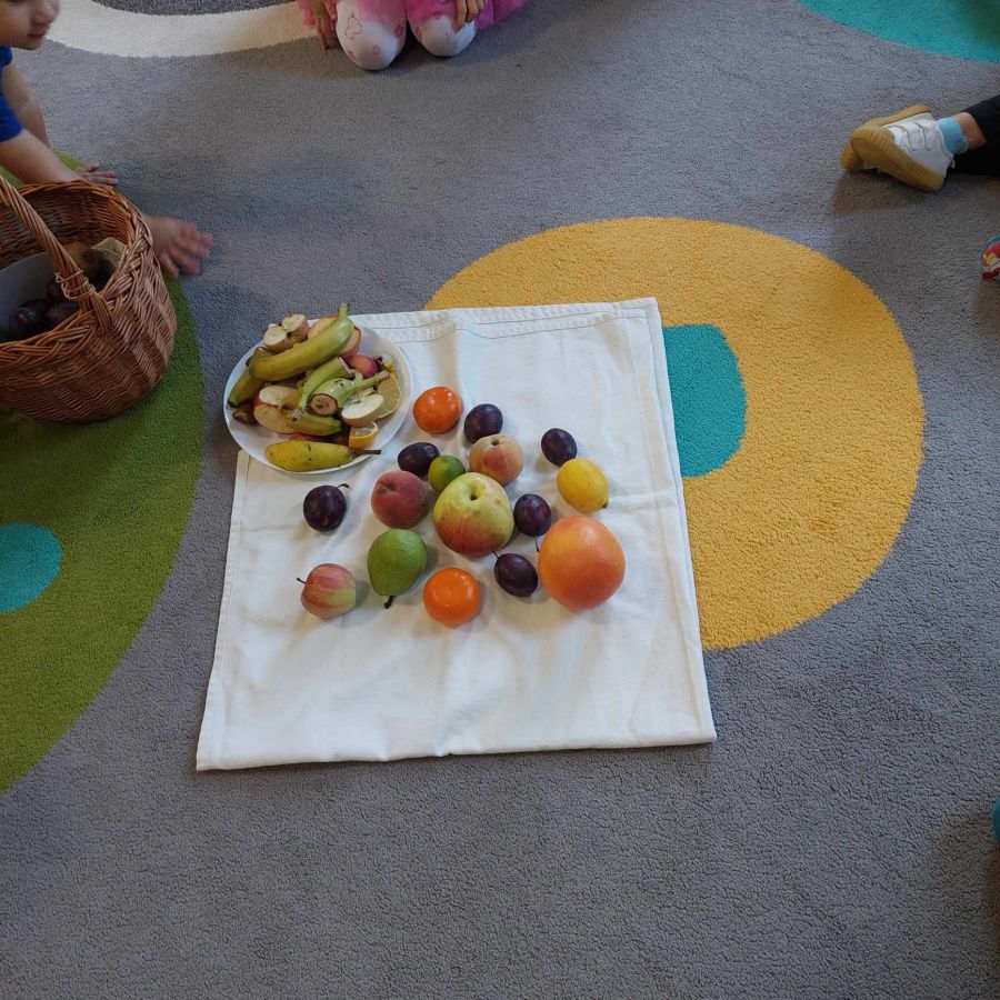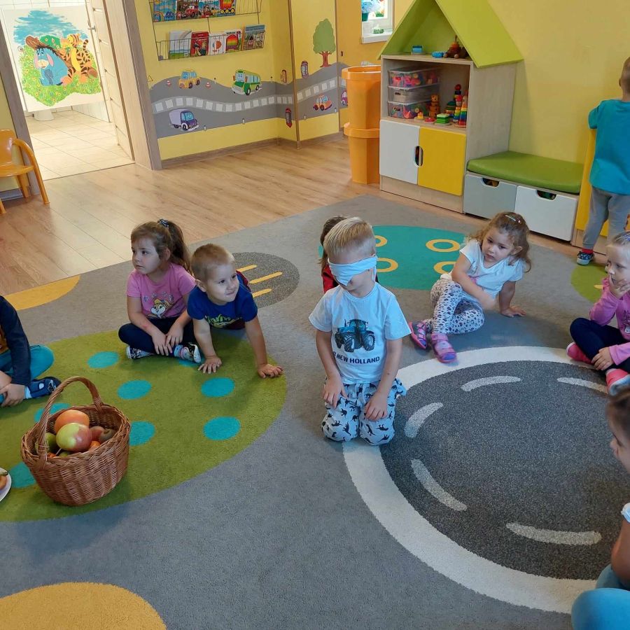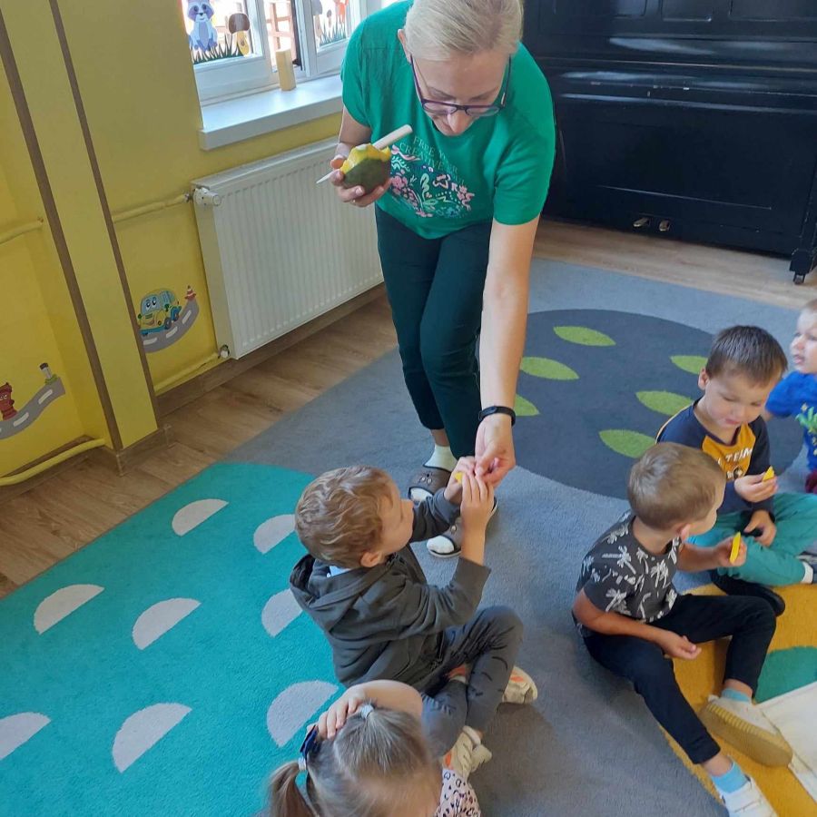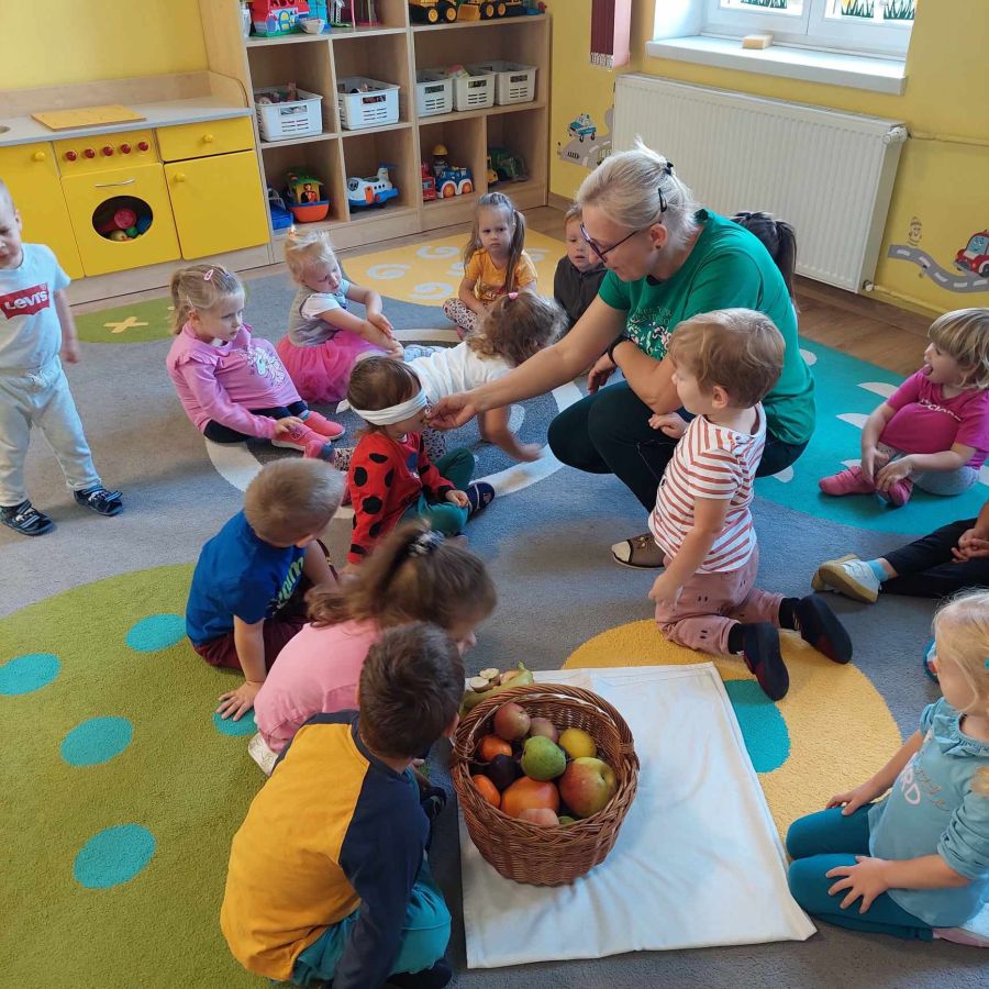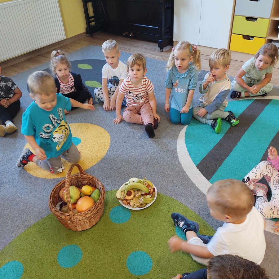 Grupa młodsza, podobnie jak starsza poznawała różne owoce wielozmysłowo. Dzieci chętnie zajadały bogate w witaminy dary natury.